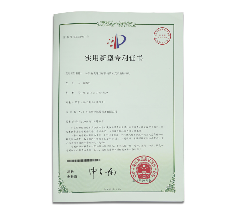 騰卓機(jī)械專利生產(chǎn)證書,專業(yè)制造包裝設(shè)備的生產(chǎn)廠家,全自動(dòng)及半自動(dòng)的洗瓶機(jī),烘干機(jī),灌裝機(jī),旋蓋機(jī),貼標(biāo)機(jī),套標(biāo)機(jī),打碼機(jī)等非標(biāo)定制自動(dòng)化包裝生產(chǎn)線