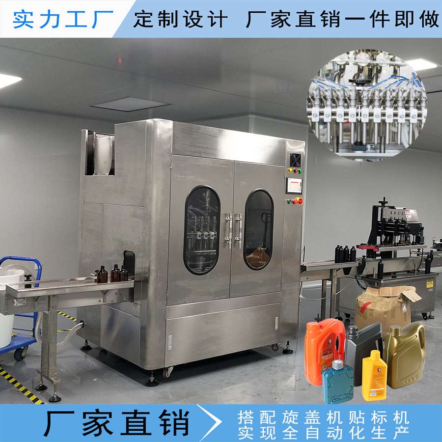 此生產(chǎn)線主要應(yīng)用于日化廠,化工廠,汽車用品等行業(yè)。例如:洗衣液,洗潔精,洗發(fā)水,沐浴露,潤滑油,剎車油,汽油添加劑等,設(shè)備采用先進的光、電、氣一體化自動控制系統(tǒng),實現(xiàn)進瓶,定位,灌裝,出瓶自動化生產(chǎn)。