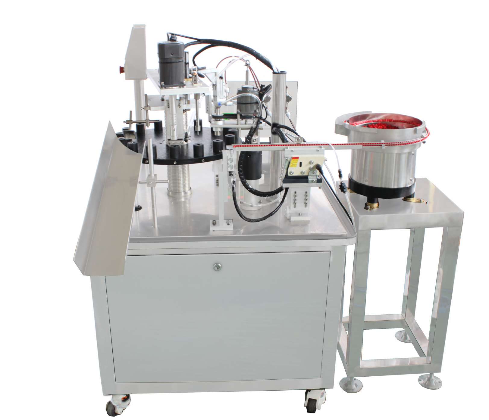 自動灌裝軋蓋機(jī)一體機(jī)可用于西林瓶、精油瓶、香水瓶全自動灌裝旋蓋及鎖蓋設(shè)備。整套流程分為:理瓶-灌裝-壓塞-掛蓋-軋蓋,其特點(diǎn)為生產(chǎn)穩(wěn)定,對包材通用性強(qiáng)。